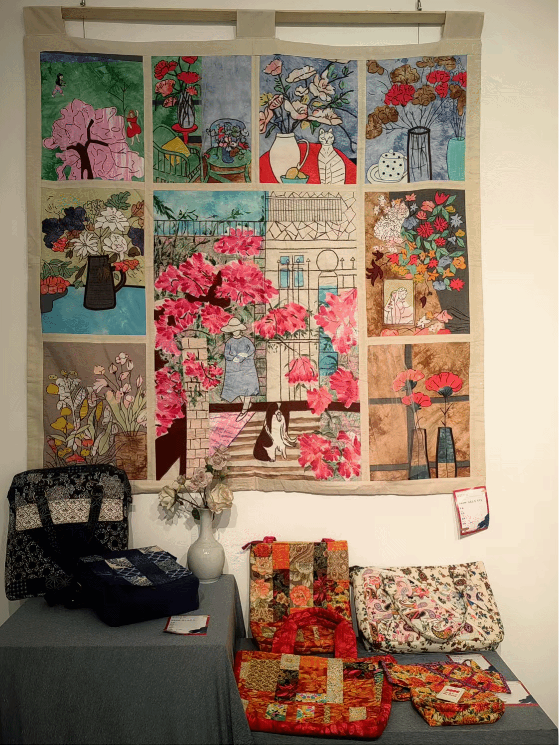 服装专业团队由学硕与专硕研究生领衔,联合服装工程本科生及环艺设计、美术学硕士跨学科协作,以创新作品探索非遗技艺的多元表达。这支打破专业壁垒的先锋队伍,以跨界思维为笔,以传统非遗为墨,在纺织经纬间编织出传统文化与现代设计共生的绚丽图景。他们不仅展示了扎实的刺绣基本功,更推出了一系列极具观赏价值的拼布包,布艺画等衍生文创作品。这支跨学科团队的创新实践,不仅是对非遗技艺多元表达的积极探索,更是一次打破学科边界、推动艺术设计教育改革的匠心实验。