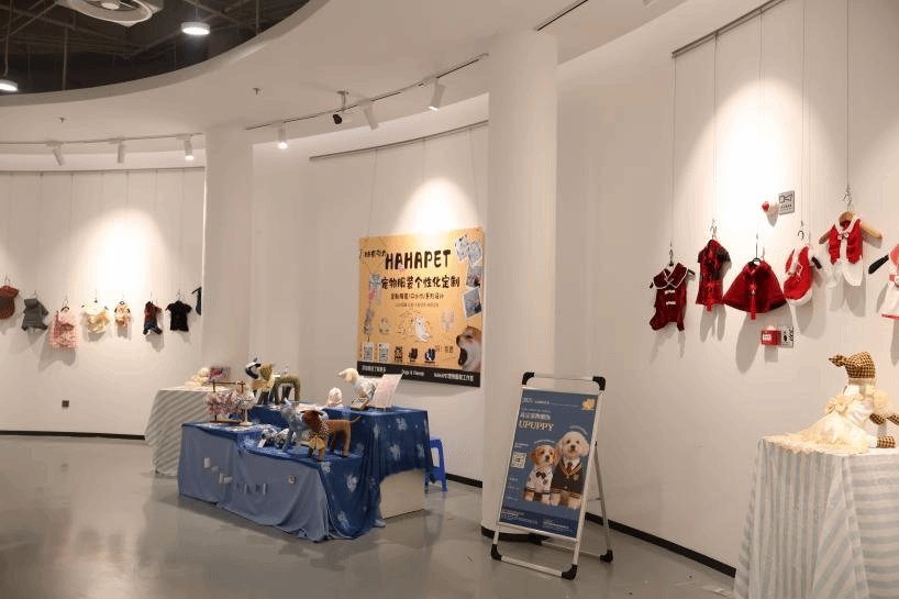 王业宏老师指导的宠物服装工作室,带来了充满巧思的作品《小招和他的朋友们》。团队利用白坯布裁剪废料进行植物染(扎染、蜡染、拓印),巧妙搭配库存面料,为比熊犬“小招”设计制作了定制“狗台”、玩具及周边。这一实践依托565net必赢客户端时尚创新研究所,探索了废料再利用与时尚设计的绿色结合点。