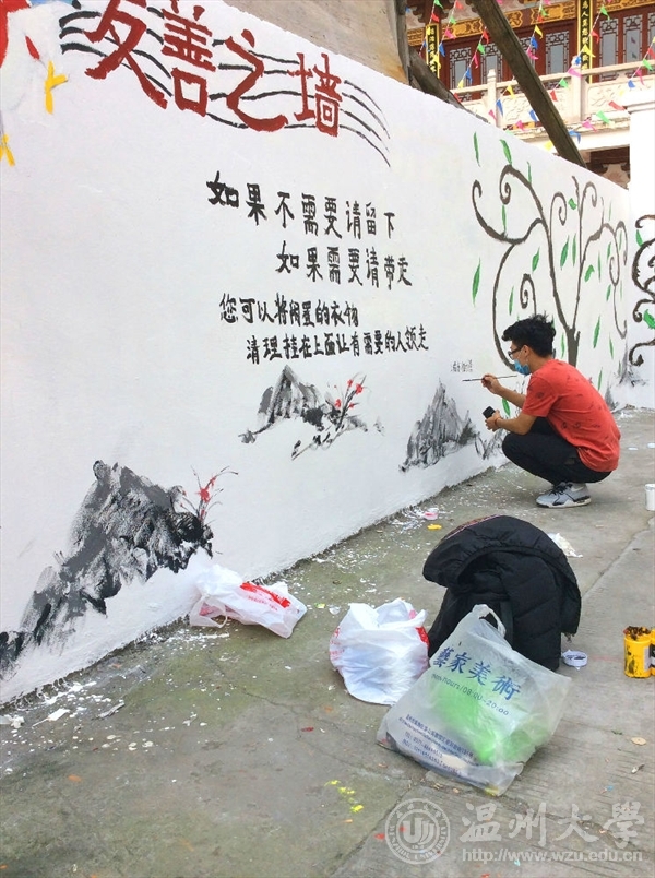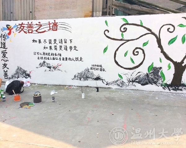 为了响应与落实市委“新青年下乡”主题精神,2016年3月26日早上八点,在必赢官网青协的带领下,来自565net必赢客户端的志愿者们前往到乐清城东街道后所村老人亭,进行了为期一天的墙绘活动。本次“新青年下乡”墙绘活动,以“弘扬雷锋精神,传递爱心友善”为主题,呼吁人们将自己的旧衣物捐给有需要的人们。这不仅是一次物质上的贡献,更多的是精神上的支持与帮助。志愿者们通过画笔和色彩,将自己想要传达的信念幻化成一颗颗正在茁壮成长的绿树,希望“雷锋精神”这一理念像这茁壮成长的绿树一样,青春常在,精神永驻。我们本次的墙绘活动一方面主要是运用专业知识与技能去服务社会,向社会宣传大学生们所理解的“雷锋精神”,呼吁社会弘扬“雷锋精神”,真正做到专业与实践相结合,使我们融入到社会中去,为社会奉献出自己的一份力量;另一方面,不仅让我们有机会了解农村、服务农村,还让我们在基层学到了许多平时难以不到的知识技能。 文:林依如图:林依如
