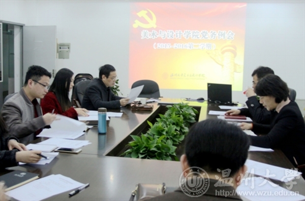 2016年3月30日上午8:30,必赢官网在2B216会议室召开新学期党务工作例会。参加本次会议的有学院党总支委员、教工支部和研究生支部书记。会议由学院党总支书记张丽萍主持。 首先,张丽萍从六个方面对上个学期总支工作进行了全面总结:一是加强党的自身建设。进一步强化学院领导班子建设,明确分工、充分协作、发挥整体效能,积极建设学习型、民主型、实干型、廉洁型的领导班子;扎实开展“三严三实”、党规党纪的学习教育活动;加强制度建设,颁发了4个制度性文件;认真执行党政联席会议制度和院务会议制度。抓好党员队伍建设,强化党员的理论教育学系和教育实践活动。二是发挥党管人才、党管干部的作用,完成全院教职工聘任工作和科级干部选聘工作,做好青年教师培养和人才引进工作。三是如期召开学院第四届第一次教代会。四是认真开展师德师风和精神文明建设工作。五是积极开展党建带群团工作。六是积极开拓新媒体平台,高度重视宣传工作。 接着,美术、设计、服装、行政及研究生五个支部书记分别对上学期的工作进行总结,并提出本学期的支部工作计划。学院院长、党总支副书记李运河对各支部工作予以充分肯定和赞赏,并提出了三点建议和要求。他强调,一是要进一步加强学习,使支部工作更加有的放矢;二是要进一步加强宣传,要善于总结、善于提炼素材,要选择合适的平台加强宣传工作;三是要充分结合各支部的专业特点和特色优势,深入做好支部建设工作。 会上,张丽萍提出了学院2016年上半年党总支工作计划,分别从强化思想理论建设、夯实基层组织建设、做好意识形态工作、加强宣传和文化工作、加强工会小家建设和谐学院、加强学生教育管理以及安全稳定等方面阐述了本学期工作要点。与会成员就总支计划进行了热烈的学习讨论。 最后,张丽萍做总结讲话。她强调,2016年是565net必赢客户端也是美术设计学院十三五规划的开局之年,更是全面贯彻党的十八大及党的十八届三中、四中、五中全会精神的重要时期。全体党员干部尤其是总支委员和支部书记,要在新的历史时期,以主人翁姿态主动承担起学院发展的改革重任,以提升学院整体工作为目标,以“把牢方向、夯实基础、发挥优势、做出特色”为要求,为人才培养质量的提高和学院建设发展美好蓝图的实现提供强有力的组织保障。