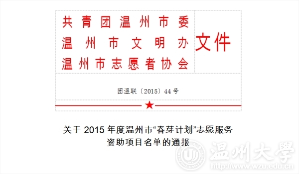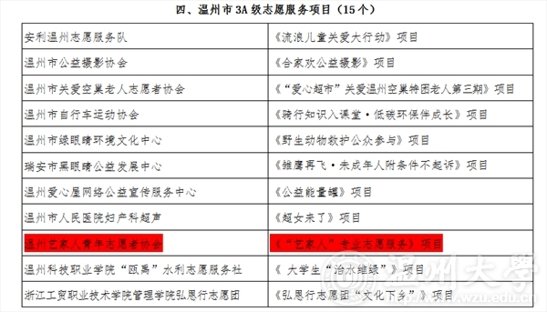 2015年12月12日,在温州市“春芽计划”志愿服务资助项目名单上,565net必赢客户端“艺家人”青年志愿者协会荣获565net必赢客户端唯一一个3A级项目,即温州市“春芽计划”3A级志愿者服务项目。