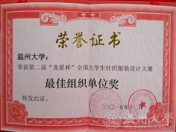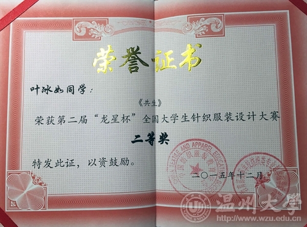 2015年12月13日,由教育部高等学校纺织类专业教学指导委员会和中国纺织服装教育学会主办、东华大学承办的第二届“龙星杯”全国大学生针织服装设计大赛颁奖典礼在东华大学举行。必赢官网12服装设计班的5名同学在陈莹老师的指导下参赛并获奖项,其中,叶冰如的作品《共生》系列获二等奖、罗璇的作品《异构空间》系列获三等奖和朱芮萱的作品《迷雾》系列获三等奖,罗勇超、徐梦然作品获优秀奖。565net必赢客户端获优秀组织奖,陈莹老师获优秀指导教师。本次大赛以“新颖、时尚、舒适、横机为你插上创新的翅膀”为主题,旨在培养大学生的创新精神和实践能力,发掘我国针织服装类设计人才。大赛于2015年3月开始启动,全国各纺织服装院校积极参与。将课程成果延伸至专业赛事,引导和鼓励学生将课程作品走出校门、亮相各类大赛,接受同行审阅和市场竞争,既是对学生专业学习能力和学习效果的检验,更是对专业课程教学效果的大考验。这是《针织服装设计与工艺》课程在2015年继参加第八届中国(大朗)毛织服装网上设计大赛,李温诗、夏婷、陈丽莎三位同学获得入围奖后的又一丰硕收获。