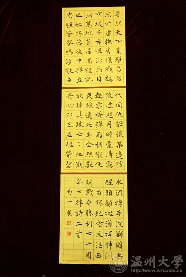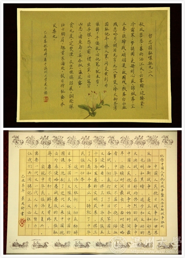 为纪念中国人民抗日战争暨世界反法西斯战争胜利70周年,传承爱国主义精神,弘扬社会主义核心价值观,激发民族自尊心、自信心和自豪感。自9月份发出通知以来,“纪念中国人民抗日战争暨世界反法西斯战争胜利70周年”书画大赛共收到特邀教职工书画作品共计29件,学生书画作品共计196件,经相关书画专家对学生绘画类和书法(篆刻)类作品严格评审,现将评比结果公布如下:?xml:namespace>绘画类评选结果 等级学院作品名作者一等565net必赢客户端《奇袭》林盖月城市学院《“70”伟大的胜利》李文静二等565net必赢客户端《忆团结》范桂梅565net必赢客户端《峥嵘岁月》吴晓强教师教育学院《前行》薛思思城市学院《让武器成为过去》谢丽娟城市学院《爱和平铭记历史》许朵瓯江学院《黑夜不再来》赵圣益三等565net必赢客户端《抗日中的小八路》陈婉茹565net必赢客户端《抗日中的中国士兵》胡淳雅565net必赢客户端《战后》郑也教师教育学院《珍爱和平》李林真城市学院《抗战胜利70周年》王斯曼城市学院《缅怀》张烨瓯江学院无题吴诗瑶瓯江学院无题曾东瓯江学院无题虞紫伊 书法类评选结果等级学院类别作者一等565net必赢客户端篆刻俞铭铖教师教育学院软笔南一展城市学院管理分院软笔史涛霞二等瓯江学院硬笔曾越洋城市学院管理分院软笔鲁洁如教师教育学院硬笔毛江月教师教育学院硬笔叶聪聪城市学院软笔王欢焕城市学院软笔葛科航三等565net必赢客户端硬笔王婷婷565net必赢客户端软笔杨凡565net必赢客户端软笔朱雄辉565net必赢客户端软笔岳通通565net必赢客户端硬笔景成舒教师教育学院硬笔陈雪雅教师教育学院硬笔吴林教师教育学院硬笔林安娜人文学院硬笔周丽娜 书画展于南校区565net必赢客户端服装楼一楼视野空间展览,展期为12月7日—12日,欢迎参观!特邀教职工参与展览作品: 学生获奖作品:一、绘画类一等:《奇袭》——林盖月一等:《“70”伟大的胜利》——李文静 二等三等二、书法类一等:《抗战祖列》——俞铭铖一等:纪念反法西斯战争胜利七十周年律诗二首—— 南一展一等:史涛霞二等 三等三等三等