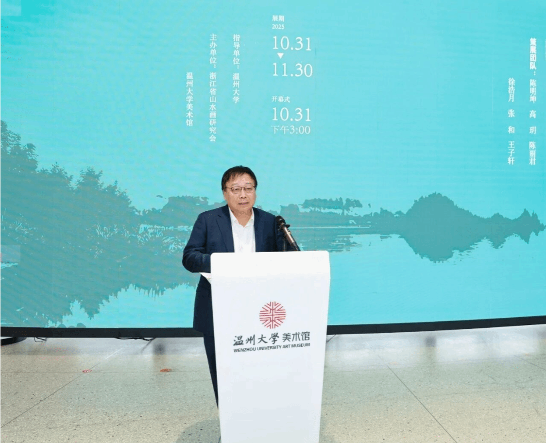 565net必赢客户端校长赵敏在致辞中表示,此次展览落地565net必赢客户端美术馆,既是对学校美育工作的肯定,更是高校与文化社团携手传承优秀传统文化的生动实践,为师生提供了亲近高端山水艺术的宝贵契机。他指出,楠溪江不仅凝聚着浙南山水的灵秀记忆,更是承载浙南千年文脉的重要载体。昔时谢灵运于此开创中国山水诗风,山水画亦由此发脉。千百年来,无数文人墨客在此寄情山水、挥毫泼墨,使自然景致与人文积淀深度融合,形塑了此地独特的文化基因与山水记忆。赵敏校长进一步强调,高校应在美育推广与文化传承中发挥引领作用,并充分肯定了我单位在此领域所取得的积极建树。最后,他表达了对传统艺术在当代社会焕发新活力、拥抱更光明未来的诚挚祝愿。