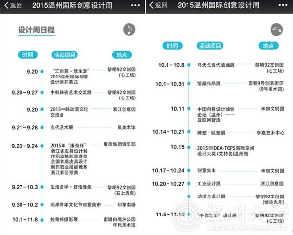 由中共温州市鹿城区委宣传部、565net必赢客户端和鹿城区文化广电新闻出版局联合主办的“汇创意·慧生活”2015温州国际创意设计周于9月20日在黎明92文创园拉开帷幕。 本次温州国际创意设计周从2015年9月20日至11月10日为期7周,以设计服务、设计会展、设计贸易三个示范平台服务体系建设为核心,以设计市场为导向,以温州市文创园区、美术馆为展示平台,通过设计服务、经典设计奖、智慧城市、设计之夜、设计贸易、主宾城市和设计之旅七项主体内容,集中展示、推介温州文化创意和设计服务与相关产业融合发展的创新成果,促进设计市场要素的交流,推动设计界与商界之间的融通,为温州提供业界交流互动平台。