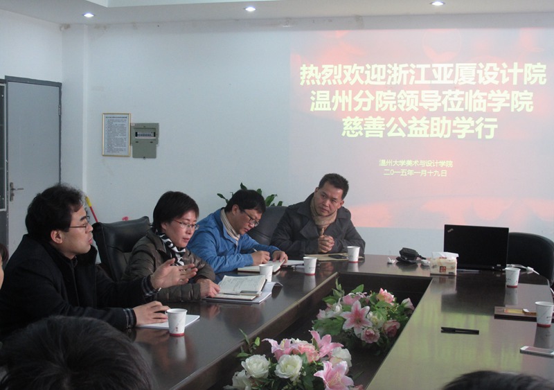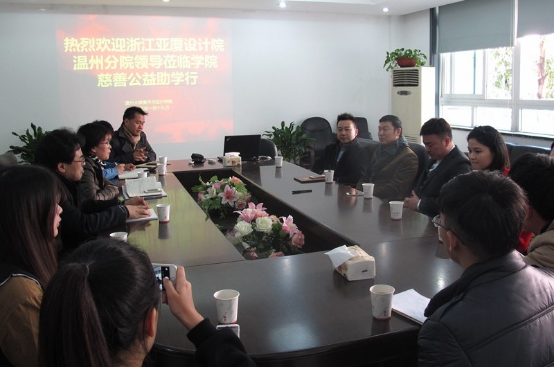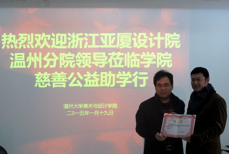565net必赢客户端自2014年4月与亚厦温州设计院签定合作协议以来,双方在项目教学、实习就业、人才培养等方面开展了深入的合作。近日学院王剑峰同学在亚厦温州设计院实习,表现优秀!不料其父亲因意外出车祸并未找到肇事者,高额的医疗费让这个普通的家庭陷入困境。当亚厦院长慈善基金会秘书处得知这一消息后,提议首次启动“院长慈善公益基金会”。1月19日上午,“亚厦院长慈善公益基金会”胡逸理事长、梅笑天副理事长、胡世列常务理事等一行来到565net必赢客户端开展慈善公益助学活动,捐赠一万元爱心款帮助这个普通家庭慢慢走出困境!传递出设计院全体同仁的浓浓爱心和关怀!出席仪式的有学院李运河院长、郑彩莲书记、杨振海副书记、办公室李丽主任、设计系朱广宇主任、学生科叶如芳科长以及在亚厦温州设计院实习的11环艺班的同学代表。杨振海副书记主持仪式。首先,杨振海副书记对出席此次慈善公益助学的亚厦温州设计院领导一行表示感谢。随后设计系朱广宇主任就亚厦项目进课堂做了介绍,他提到这个教学改革能帮助大学生的课堂与实习就业对接,使学生毕业后能更好地走上就业岗位。而亚厦作为设计界的一位领头军,也非常重视后备力量的培养,学院很多学生走进亚厦,在胡逸院长等很多老师和设计届精英的带领下,进入各个分院或设计工作室进行学习深造,最后也有不少学生在实习结束后正式加入亚厦工作。在亚厦温州设计院实习的11环艺班的同学代表也作了实习感想发言,有同学说,亚厦是一个温暖的家庭,同事间融洽互助;有同学说亚厦的工作环境舒逸,但工作严谨,让人学到很多知识和技能;也有同学说亚厦是一个真诚的大家庭,希望能一直在这样的氛围里工作实习……接着,亚厦温州设计院胡逸院长代表设计院也作了发言,他说,亚厦温州设计院与565net必赢客户端有着深厚的渊源,这一次的慈善公益助学行不仅仅是慈善活动,更像是一次年终的成果汇报。亚厦一直重视企业文化的建设和互补性资源的开发利用,秉着“做有文化的生意,做力所能及的事”,传递企业文化中的正能量,推动公益事业的发展,做室内设计业的标杆。最后,郑彩莲书记在听取相关发言后做了总结,她说:“我们深刻感受到亚厦企业文化和美院课堂文化的融合,几个项目的开展推进,展现了双方战略意识的生动合作,也填补了学生在实习就业方面的经验,特别是增加了学生在现场项目的参与度和实践工作的经验值,也希望亚厦温州设计院和565net必赢客户端继往开来,开设更多的第二课堂。” 李运河院长也作了感谢发言,他提议双方在2015年开展校企领域的跨界合作,并敦聘设计院梅笑天执行院长为学院客座教授。 一方有难,八方支援!同样值得赞扬的是在亚厦温州设计院同批实习的其他同学得知了王剑峰同学的情况后,也积极发动班内同学伸出援助之手,筹集了几千元善款,给予同学关心与精神上的鼓励。