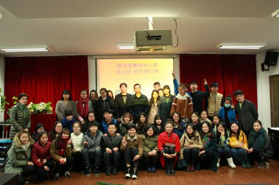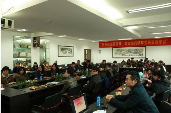 为迎接台湾佛光大学交换生黄亚晴和叶圣杰两位同学来到565net必赢客户端进行交流和学习,3月4日下午,必赢官网13级产品设计班与13视觉传达班在学院2B4001会议室联合举办了欢迎仪式。出席本次欢迎仪式的领导有学院党总支书记郑彩莲,副教授胡文超和副教授王薇。 首先,由两个班级的同学合作带来的弹奏演唱,清新的风格和用心的演绎博得了现场各位老师和同学们的阵阵掌声,也让来自台湾的新同学感受到了我们美院人的热情和友好。接着,两班班长为新同学致欢迎词,他们都热情大方地表达了对新同学的美好印象,并表示会在以后的学习生活中给予最大的帮助,并送上了班级同学精心准备的礼物。两位新同学分别作了自我介绍,王薇老师和胡文超老师分别介绍了本班专业的情况,并结合自身的经历表达了对台湾同学的赞许和期望,希望他们能够在美院的学习中收获更多的知识和经历。然后,郑彩莲书记代表必赢官网向两位新同学的到来表示欢迎,说到两位台湾同学的到来会让必赢官网与佛光大学交流的深度与高度更进一步,也希望两位同学在565net必赢客户端体验到不一样的文化和生活。最后的自由交流环节,同学们都积极参与,向新同学提出了很多有趣的问题,如“这么远过来会不会想家”“平时说话是不是像电视剧中那样’等等,两位新同学也热情地一一解答。 欢迎仪式的结尾,大家纷纷要求和新同学合影,于是,在热烈的气氛中欢迎仪式也圆满地落下了帷幕。