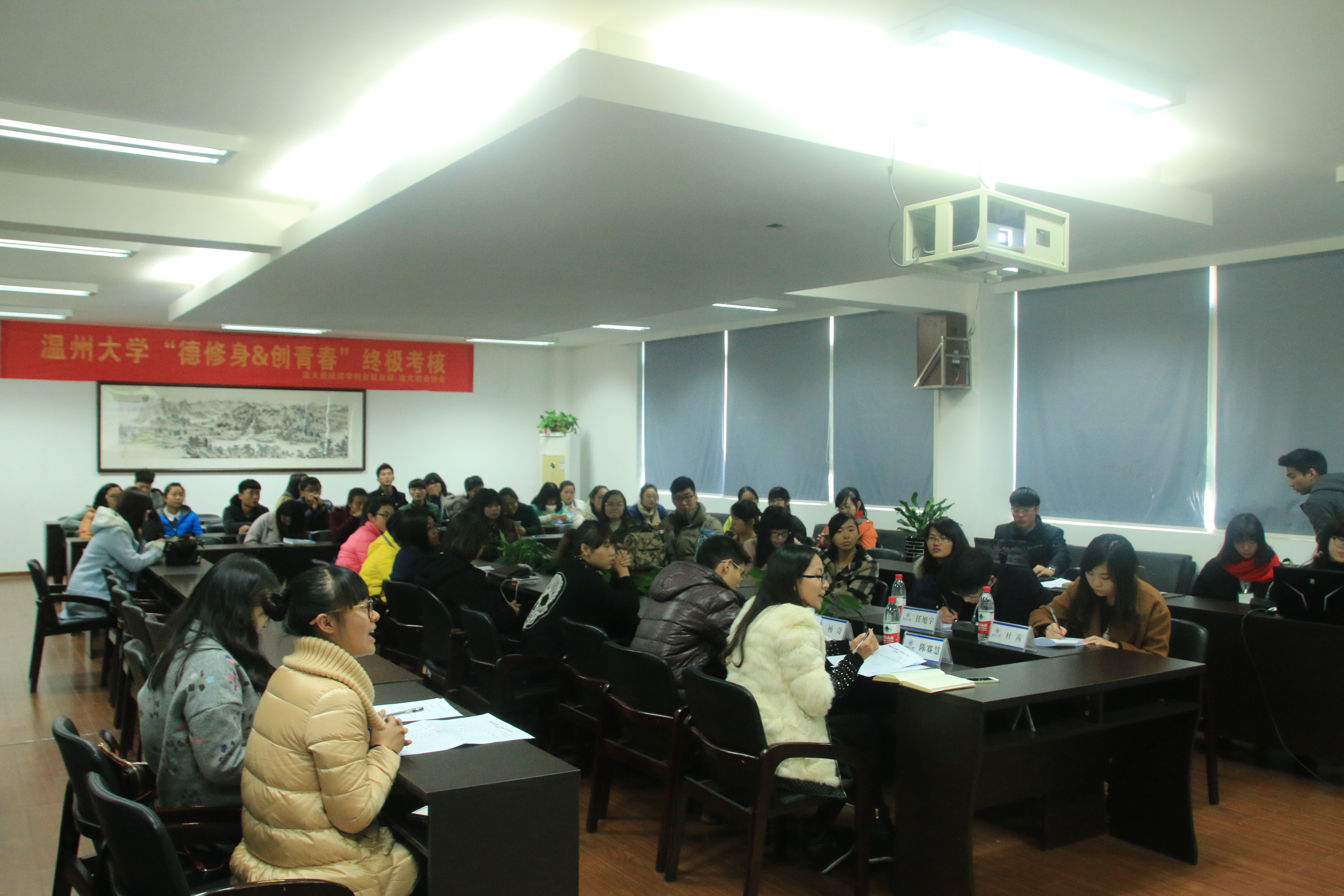 2014年12月24日下午,由必赢官网团学创业就业部和温大创业协会联办的为期半年的“德修身&创青春”创业就业系列培训活动于美院2B4001会议室,圆满地落下了帷幕。出席本次终极考核的嘉宾有必赢官网学生科辅导员杜茜老师、陈赛慧老师、温州仟度品牌设计有限公司负责人任旭宇先生和商学院研究生杨奇学长担任评委。来自校本部、城市学院和瓯江学院的学生们都积极参加了本次终极考核。