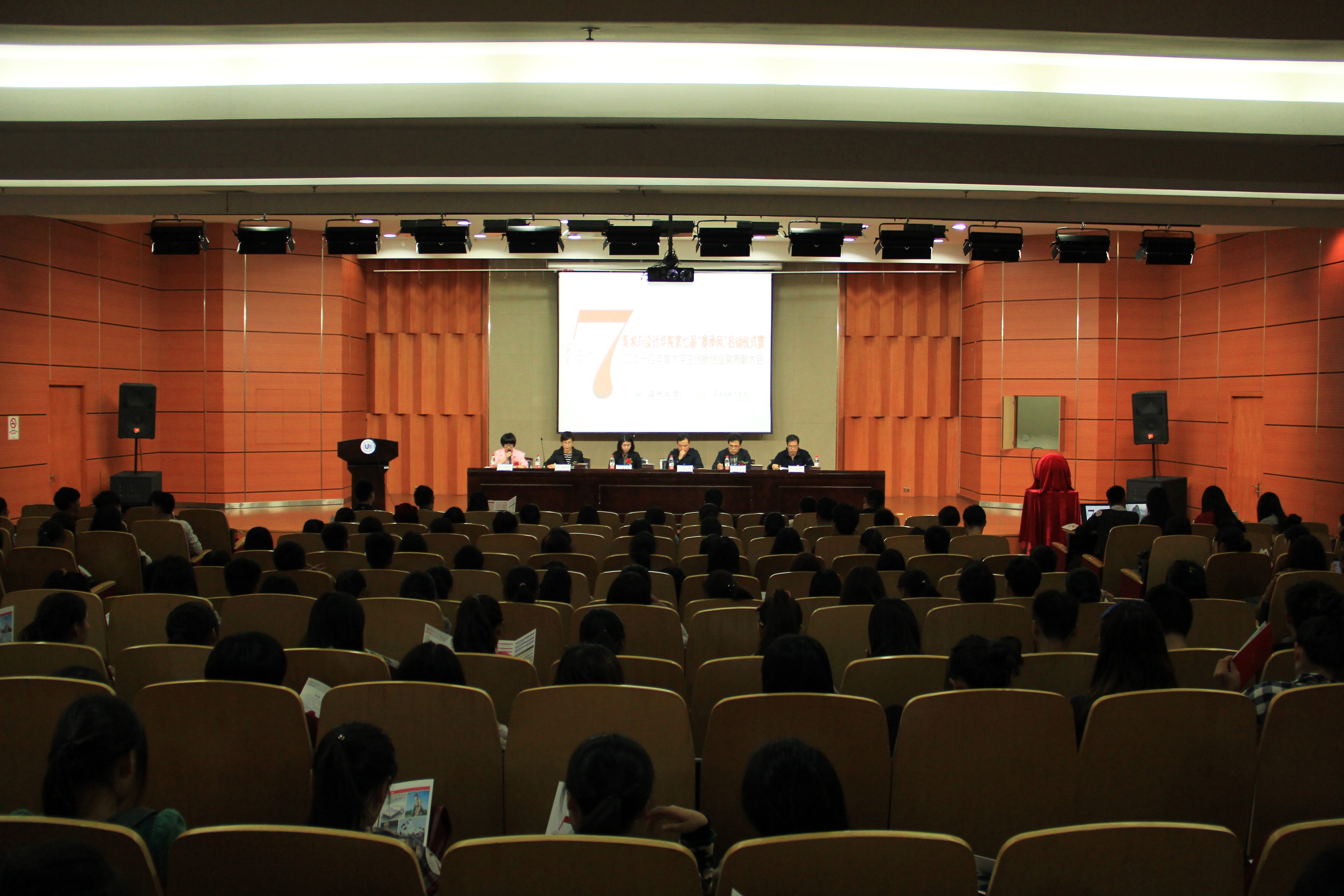 在开启新一届的“赛季风”之前,大会回望过去一年的辛苦付出与满满收获,表彰在上一届赛季风取得优异成绩的同学。2014年度大学生创新创业奖表彰大会在激昂的乐曲中开始。首先由蔡可群副院长代表组委会宣读了第六届“赛季风”活动孵化的优秀作品名单,其中,国际国家级奖项3项,国家学会级和省级奖项7项,省学会级和市级奖项23项,此外还有校级奖项83项。作品内容涵盖美术、服装、设计、创新创业四个方面,包括鞋靴、服饰、书画、摄影、海报、广告、创业项目等等。一件件精美的作品后面是参赛同学与指导老师的智慧、创意与汗水。