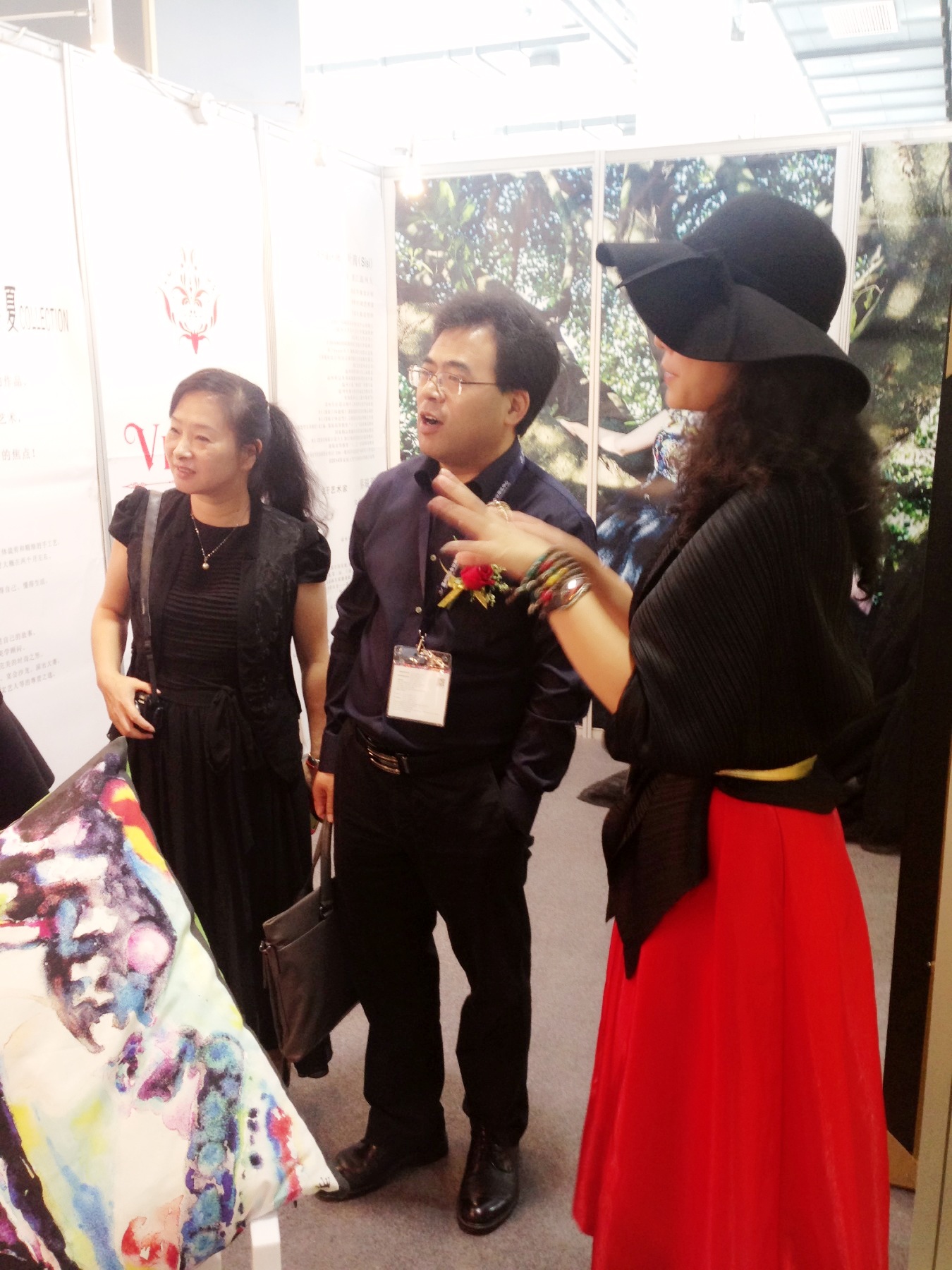 在近日2014温州国际时尚博览会的现场,一个很有特色的展位以惊艳的视觉捕获了参观者的眼球。象画廊、又似戏曲舞台,看似传统却透着时尚,这便是由温大565net必赢客户端副教授叶茜携手著名画家蔡瑞蓉女士(温大美院教授)的“绝代风华”跨界系列作品。她从艺术作品中提炼画面的视觉,让传统民间皮影文化成为时尚艺术,运用现代数码印花的工艺技术以鲜艳的色彩真实的传递了这一季独具魅力的焦点!本次作品叶茜老师同时结合了指导学生的国家创新创业课题的项目“IN-数码印花创意产品研发工作室”,她与参与指导的叶婷老师一起研究数码印花的工艺和面料效果,并让学生参与图案设计及应用,作品有时装、礼服和家纺等应用产品,在工艺制作上也得到了浙江丽丰服装科技有限公司和杭州宏华数码印花的大力支持。温大565net必赢客户端院长李运河教授和服装系主任陈明艳教授特意到场观看,并高度评价!