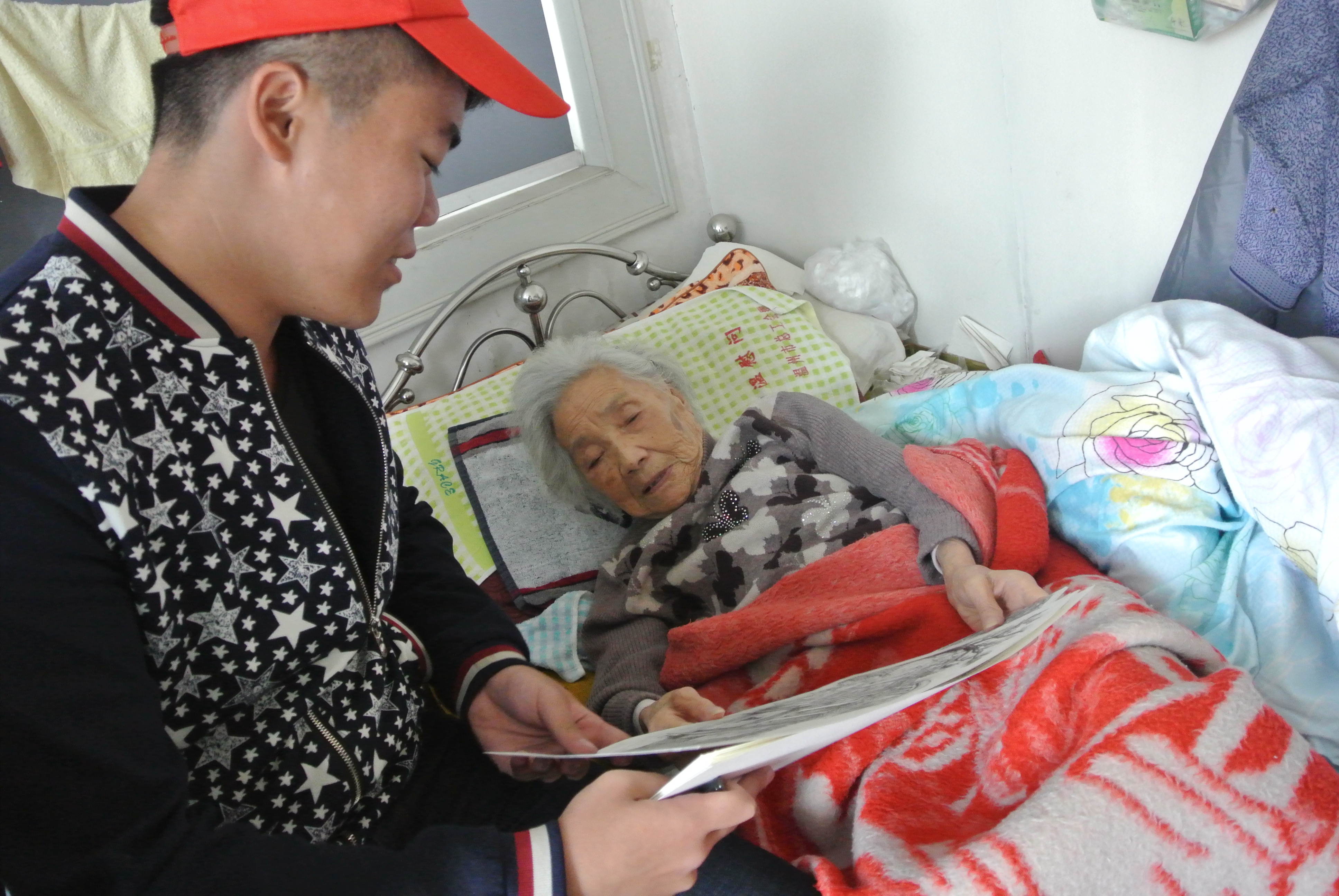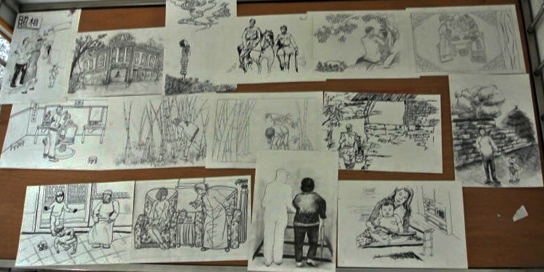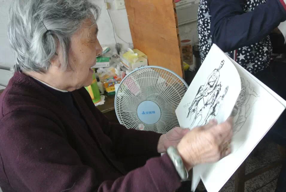 在交流过程中,一位96岁老人的女儿和孙女正巧来看望老人,当志愿者向他们说明来意后,老人的女儿很激动,积极的向志愿者们说老人这一生的故事。老人年轻的时候貌美如花,在花样年华里她遇到弃政从商的他,两人一见钟情,结婚生子,后来国共内战,共产党执政,在十年文革时期,因为老人的老伴是国民党又从事资产事业,所以被抓走过了五年的牢狱生涯,老人一人支撑起整个家庭,拉扯几个孩子长大,后来的事情老人也记不清了,我们也无从得知,只是这其中的艰辛是我们无法想象的。谈到过去的岁月,老人和她的女儿曾一度哽咽,志愿者们根据老人的故事,绘画出栩栩如生的过往场景。当老人拿到志愿者递到他们手中的画后,脸上展现出来幸福的笑容,凝望着图画久久沉思。