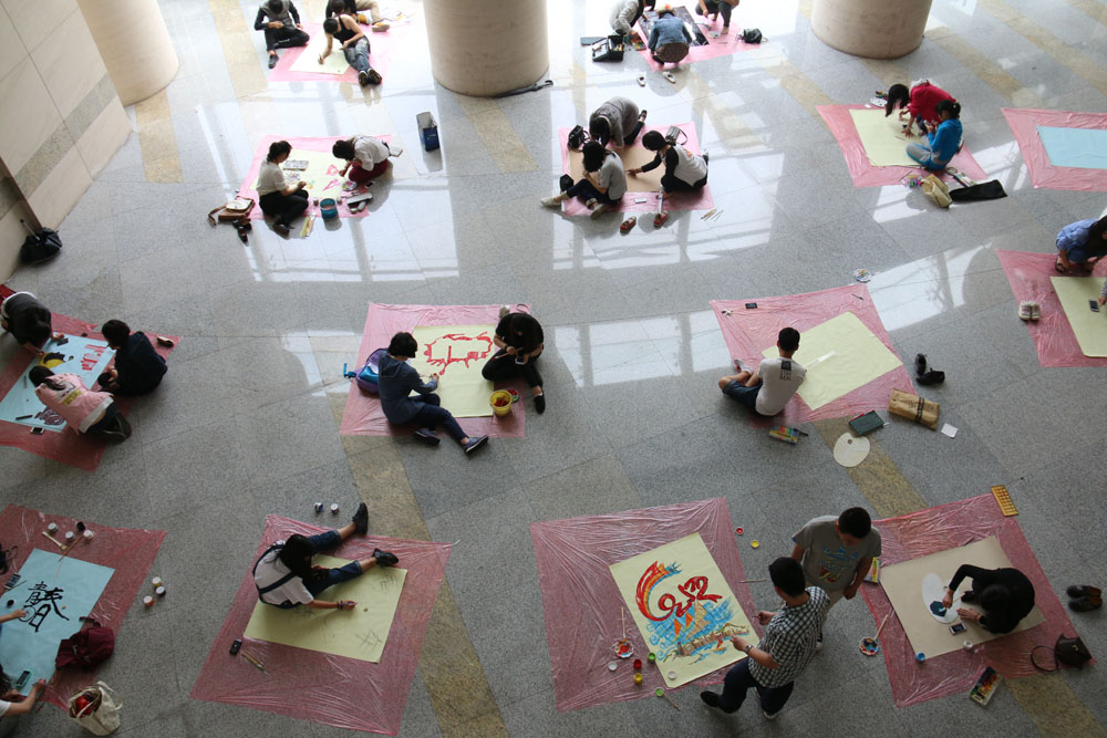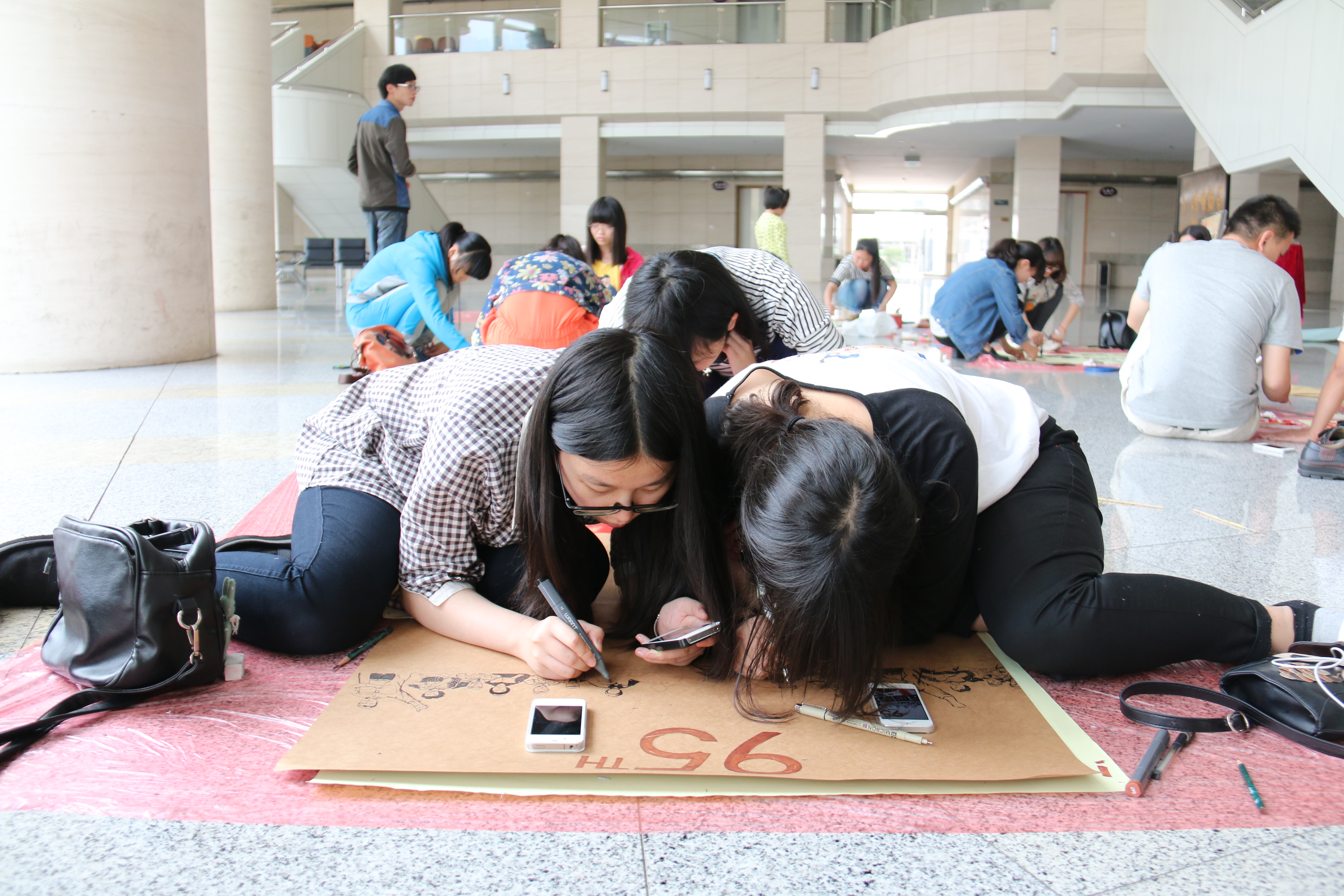 4月27日下午,于南校岩松堂一楼大厅举办了“五四青春,艺启梦想”主题海报现场设计大赛。比赛吸引了全校各个学院的同学,大家朝气蓬勃,成群结队地走进了赛场。 比赛现场气氛轻松欢快,在优雅的音乐声中,参赛选手们灵感涌现,在海报上泼墨挥洒,张扬个性。随着音乐,选手们仿佛抛开了所有的杂念,沉浸在艺术的殿堂中。比赛分为团体组和个人组,团体组激烈地对画面展开讨论,交流彼此的海报构思;个人组则沉浸在自己的构思中,忘我地画着属于自己的小天地。有的海报张显着年轻的激情,有的海报蕴含着唯美的意境,有的海报怀旧复古,还有的海报充满了积极向上的正能量。 据悉,此次绘出的优秀海报设计作品将会于5月4日在565net必赢客户端一楼大厅内展示,学生们用自己的方式为“五四”青年节送上了别具特色的祝福!