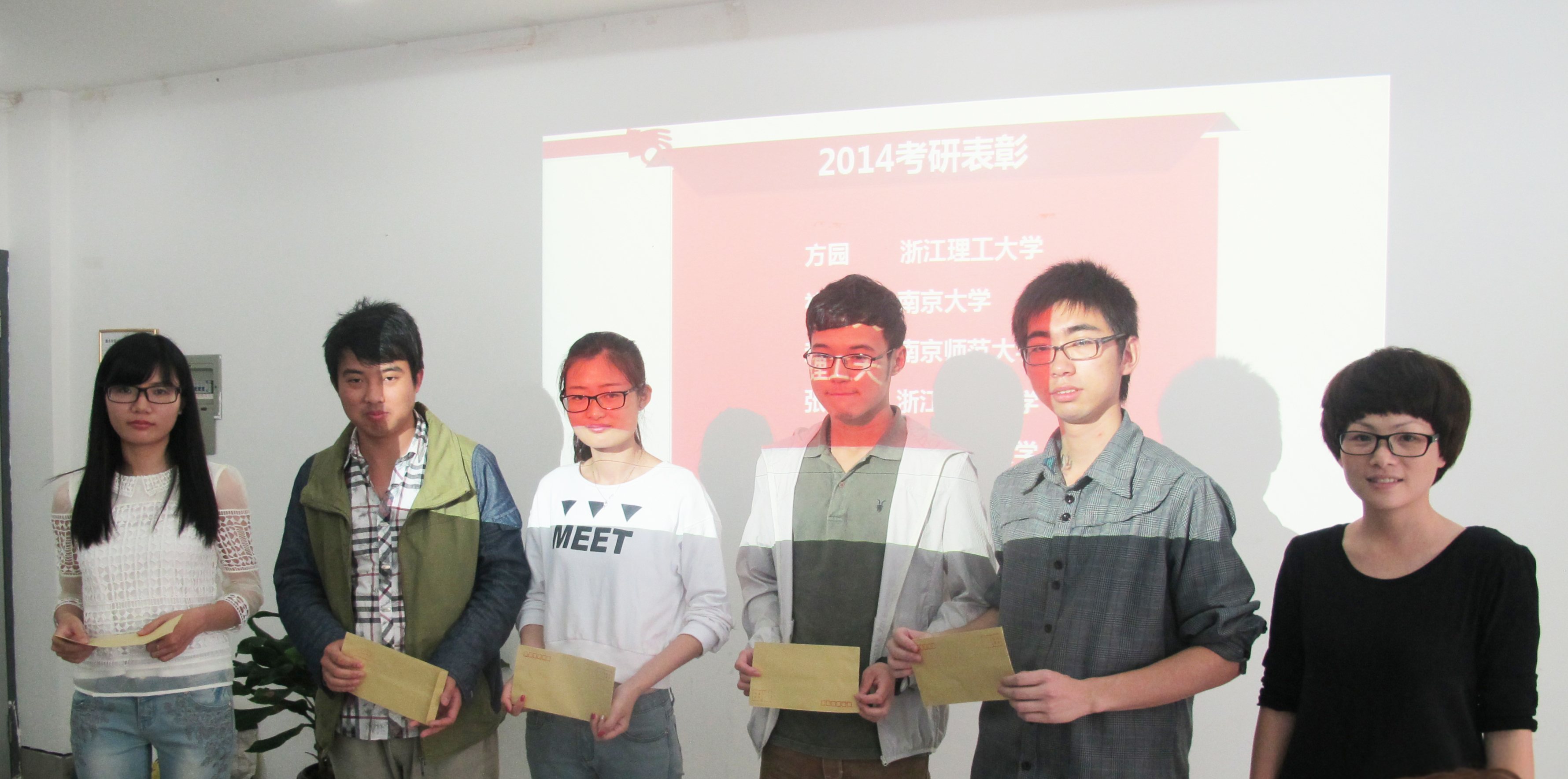 叶老师首先对必赢官网2014年国内考研成功录取的美本师范班褚明敏、服装设计与工程班方圆、环境艺术设计班赵锦程、美本班张伟佳、服装设计班邬仁亚,和国外考研成功录取的环境艺术设计班袁炜楠、平面设计班李奕璠、鞋靴设计班魏子八位同学进行了表彰仪式,并颁发了学院奖金。叶老师讲到,考研经验交流会让在座的每位同学能够真切、直观、详实地体会考研路上的辛苦与喜悦,相信在知识道路上坚持的同学们都会收获更好的自己!