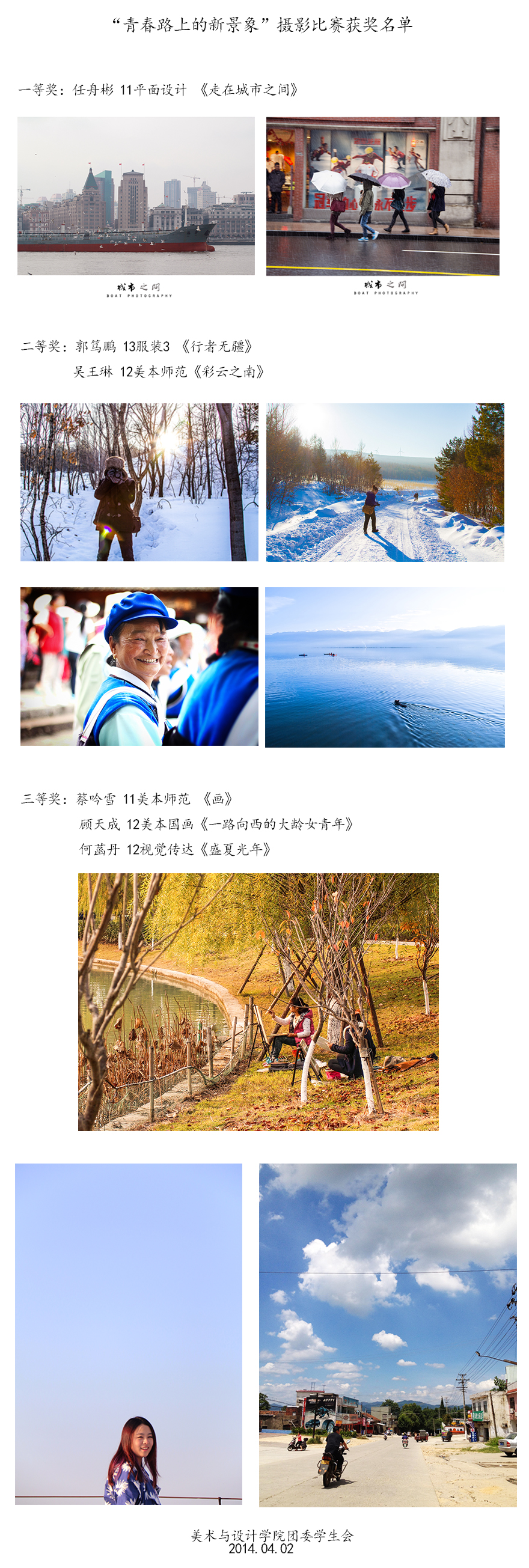 3月 3日—3月18 日,565net必赢客户端团委学生会素质拓展部开展了主题为“青春路上的新景象”的摄影比赛,本次活动特邀了必赢官网学生科辅导员陈赛慧老师担任评委。 活动得到了许多同学的积极参与,同时也征集到了很多优秀作品。拍摄的画面有穿梭于城市街角的忙碌身影;有大东北冬日的雪地风光;有用画笔描绘温大的美丽校园;更有一路向西的大龄女青......同学们用镜头捕捉下了生活中的美好瞬间,留住了点滴的温暖和幸福,让稍纵即逝的感动成为永恒! 摄影,是记录,也是创造。透过镜头,瞬间的精彩被永远封存,它是一门让广大学生既陌生又好奇的艺术,它能形象地记录发生在我们身边的点点滴滴。此次活动为在校大学生提供了一个展示自我摄影技能的平台,丰富了同学们的课余生活。青春路上并不缺少美,只等你去发现! 附:“青春路上的新景象”摄影比赛评选结果: 一等奖:11平面设计 任舟彬《走在城市之间》 二等奖:13服设4班 郭笃鹏《行者无疆》 12美本师范 吴王琳《彩云之南》 三等奖:11美本师范 蔡吟雪《画》 12美本国画 顾天成《一路向西的大龄女青年》 12视觉传达 何菡丹《盛夏光年》