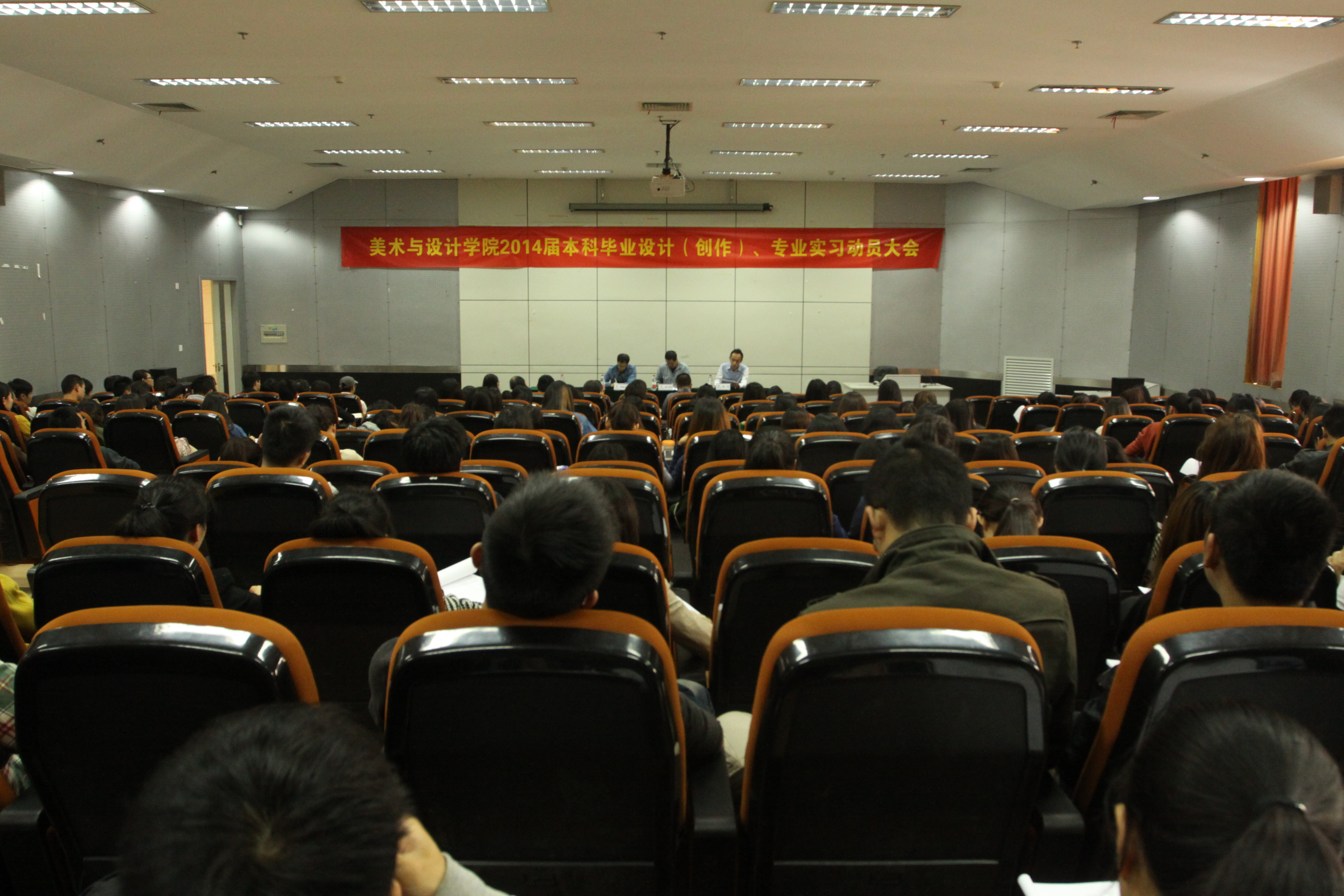 为顺利开展2014届毕业设计工作,11月8日上午,565net必赢客户端2014届本科毕业设计(创作)、专业实习动员大会在学校会展中心叶适厅举行。学院副院长蔡可群老师,副书记杨振海老师,教学科邹青老师,及美术、设计、服装三个系的系主任、各位毕业设计指导老师及全体14届本科毕业生参加了会议,会议由邹青老师主持。