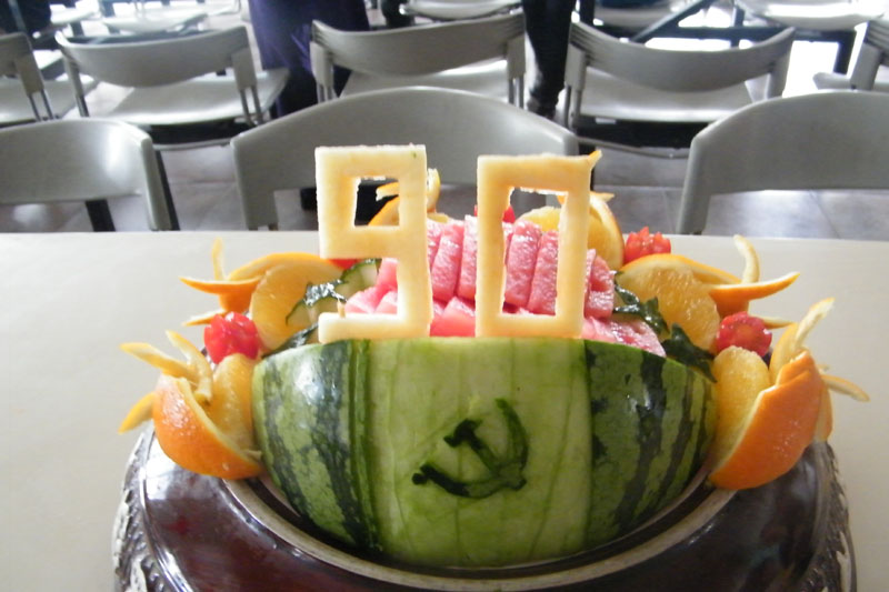 2011年5月15日星期日下午2点在南校A区好果子餐厅二楼举行了一次乐趣颇多的水果大比拼活动。除了许多以寝室为单位的参赛者踊跃加入其中外,还有团学的主席团成员。此次活动主要由公寓自律委员会主办开展。 此次活动的主题围绕建党90周年展开,主要分为三个环节,其中第一环节为制作环节,活动提供主要有黄瓜,苹果,菠萝,不同颜色的小番茄等供同学们随意选择。各组选手们有30分钟的时间来制作自己的拼盘,可根据自己的构思拼凑出完美的图案。大家乐于其中,认真地雕刻着自己的作品。第二环节为评讲环节,由每个作品的创作人在这一环节中对自己的构思 ,创作灵感,以及对作品寓意进行讲解,时间为一分钟,最后由评委打分选出本次比赛的获奖者。第三个环节即是大家愉快地品尝自己的果实,其乐融融。比赛奖项设置如下:最佳合作奖2名 最有创意奖2名。 今年的水果拼盘活动没有比赛的激烈,有的只是温馨的场面,有的只是水果的香甜和几十名学生的热情。就在这样有着果香、热情、笑声以及欢乐的情景下,同学们充分利用自己的动手能力以及发挥自己的想象力和创新能力,利用平时经常遇到的水果,摆出了一个个令人惊奇的画面,让我们不仅享受到了水果带给我们的清新感觉,更让我们在视觉上享受了一场大餐。本次比赛不仅锻炼了学生的动手能力,更加锻炼了大家的分工合作能力。更使寝室成员的融洽度增加。期间也宣传了建党90周年的知识,不忘为党的节日庆祝下。
